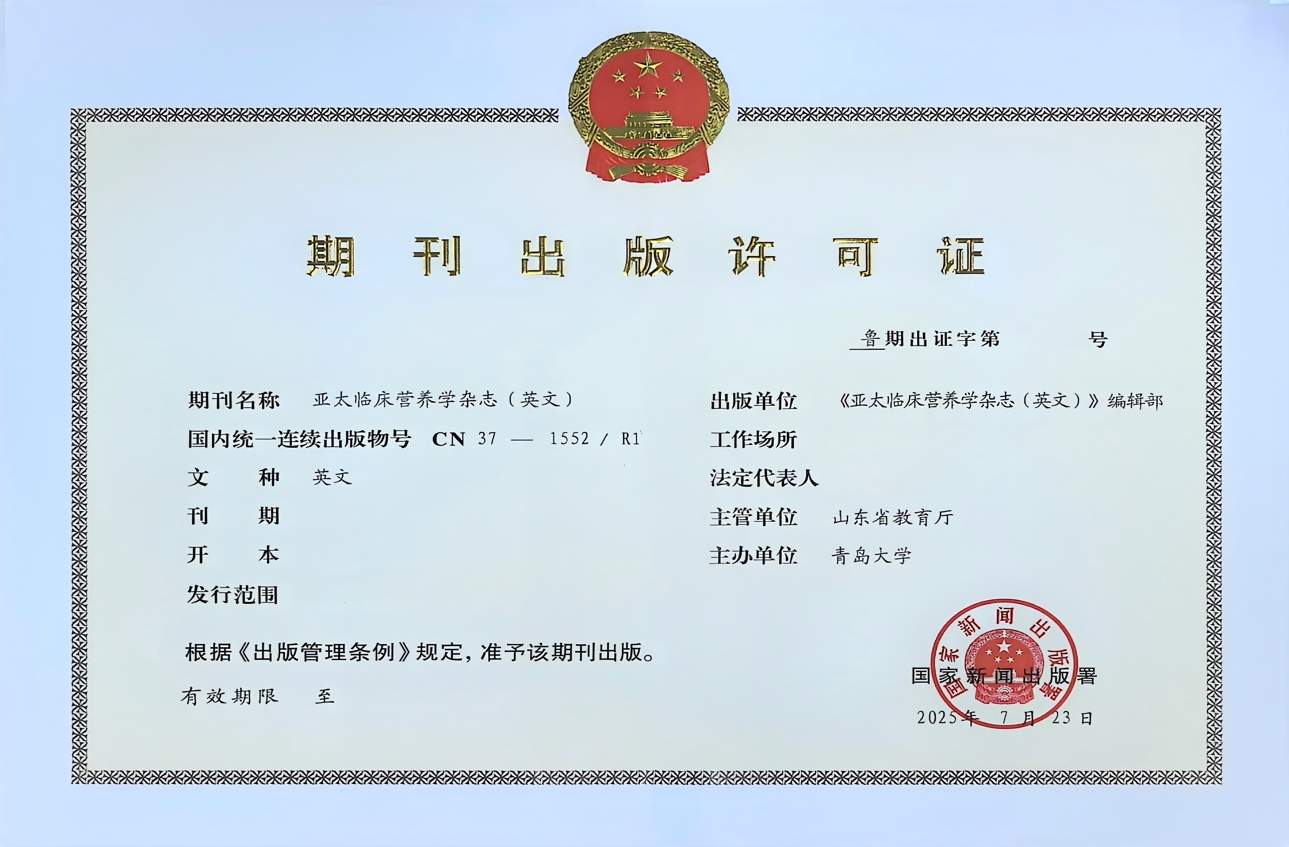 近日,《亚太临床养分学(英文)》期刊国内统连续续出书物号为(CN号):CN37-1552/R1,双月刊,公开辟行,从管单元为教育厅,从办单元为青岛大学。此次获批,标记着《亚太临床养分学(英文)》的办刊成效获得承认,也为进一步提拔我校高程度期刊学术合作力和推进期刊高质量成长添加了新动力。